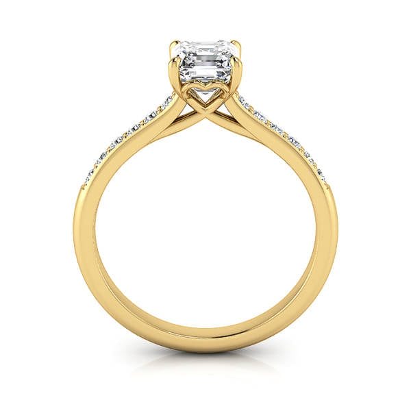 Our Asscher Cut Solitaire Accent Diamond Ring RSA1 in classic Yellow Gold features a pavé row of (12x) 1.4mm diamonds down the band for extra sparkle. The price includes the Gold or Platinum ring and the small pavé diamonds to match the quality of the central diamond you select. Complete the pricing by selecting a suitable Natural or Lab-Grown Diamond. Having selected, you can go ahead and proceed to checkout or contact us for service and friendly advice.