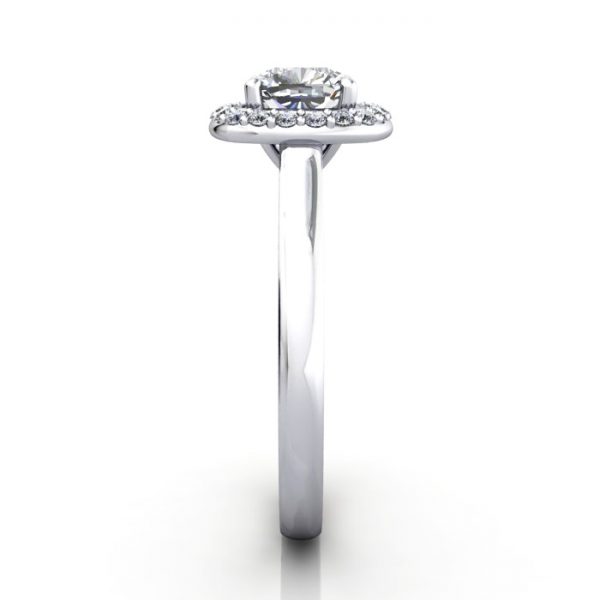 Our Cushion Cut Halo Diamond Ring RH1 in bright White Gold looks terrific. The traditional halo setting features a brilliant halo of smaller diamonds surrounding a larger centre stone, maximising the overall sparkle and creating the look of a significantly grander diamond. This style allows a wedding ring to sit flush under the halo to form a perfect set. The price includes the ring in the metal you select, along with (18x) 1.2mm round diamonds to match the central diamond you select. Complete the pricing by selecting a suitable central diamond, either a Natural Diamond or a Lab-Grown Diamond. Contact our friendly team for expert advice.