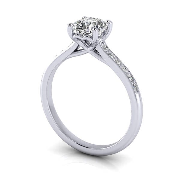 Our Cushion Cut Solitaire Accent Diamond Ring RSA1 in luxurious Platinum features a pavé row of (12x) 1.4mm diamonds down the band for extra sparkle. The price includes the Gold or Platinum ring and the small pavé diamonds to match the quality of the central diamond you select. Complete the pricing by selecting a suitable Natural or Lab-Grown Diamond. Having selected, you can go ahead and proceed to checkout or contact us for service and friendly advice.