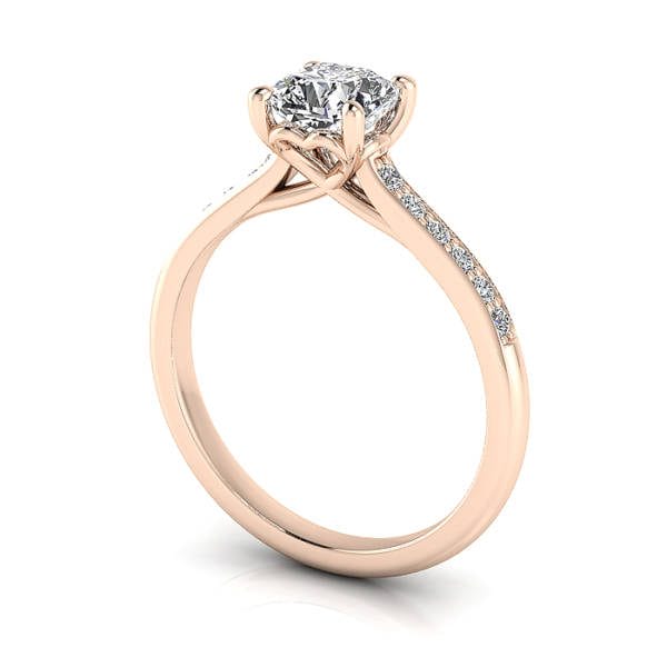 Our Cushion Cut Solitaire Accent Diamond Ring RSA1 in beautiful Rose Gold features a pavé row of (12x) 1.4mm diamonds down the band for extra sparkle. The price includes the Gold or Platinum ring and the small pavé diamonds to match the quality of the central diamond you select. Complete the pricing by selecting a suitable Natural or Lab-Grown Diamond. Having selected, you can go ahead and proceed to checkout or contact us for service and friendly advice.
