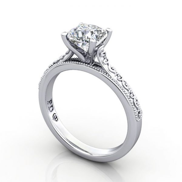 Cushion Cut Solitaire Diamond Ring RS50 in luxurious Platinum, features a stunning vintage ring style. This ring design has a vintage look with engraved filigree curls on top of the band and milgrain beading. It’s a fantastic style that forms a talking point and looks fabulous. The RS50 is a stunning, unique and beautiful style. Although the ring defaults to Platinum and features a 1.00-carat lab-grown diamond, you can select any precious metal and gemstone to suit. Having selected, proceed to checkout or contact us for service and friendly advice.