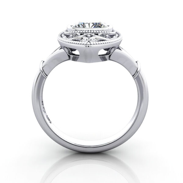 Our Cushion Cut Vintage Diamond Ring RV5 in luxurious Platinum features a stunning centre diamond secured in a protective bezel setting. The design is elevated by delicate milgrain edging and ornate filigree scrollwork, accented with petite brilliant diamonds for a touch of extra sparkle. Complete the pricing by selecting a suitable Natural or Lab-Grown diamond. Match your budget, quality and carat weight to suit your needs. Having selected, proceed to checkout or contact us for service and friendly advice.