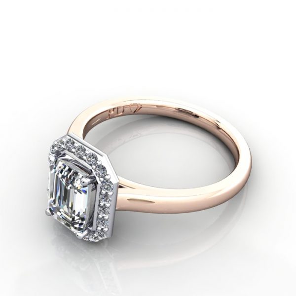 Our Emerald Cut Halo Diamond Ring RH1 in beautiful Rose Gold looks terrific. The traditional halo setting features a brilliant halo of smaller diamonds surrounding a larger centre stone, maximising the overall sparkle and creating the look of a significantly grander diamond. This style allows a wedding ring to sit flush under the halo to form a perfect set. The price includes the ring in the metal you select, along with (18x) 1.2mm round diamonds to match the central diamond you select. Complete the pricing by selecting a suitable central diamond, either a Natural Diamond or a Lab-Grown Diamond. Contact our friendly team for expert advice.