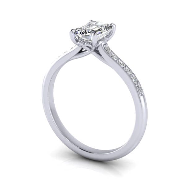 Our Emerald Cut Solitaire Accent Diamond Ring RSA1 in bright White Gold features a pavé row of (12x) 1.4mm diamonds down the band for extra sparkle. The price includes the Gold or Platinum ring and the small pavé diamonds to match the quality of the central diamond you select. Complete the pricing by selecting a suitable Natural or Lab-Grown Diamond. Having selected, you can go ahead and proceed to checkout or contact us for service and friendly advice.