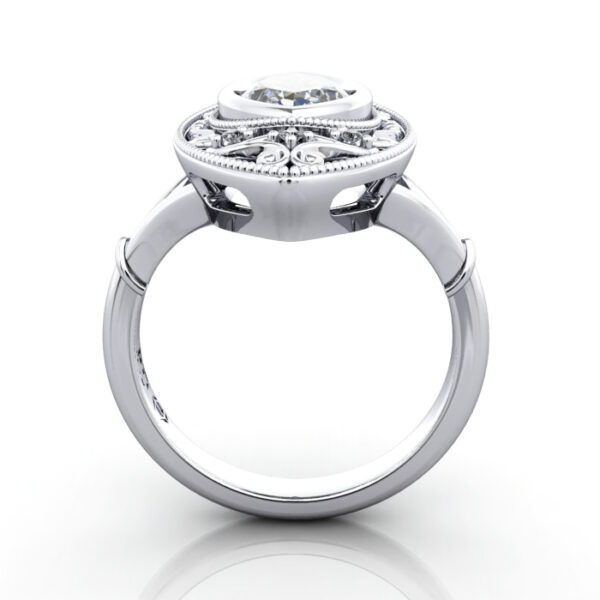Our Marquise Cut Vintage Diamond Ring Platinum RV5 is the perfect right-hand ring. This unique ring securely encloses its diamond centre piece in a beautiful marquise-shaped filigree basket, accented with a flickering of small round brilliant cut diamonds set with micro claws. Hand-polished, set, and finished with a migraine beaded edge to soften & retain the antique style this design pays tribute to. The RV5 is available with any diamond to suit your budget. Contact us for qualified advice and friendly service.