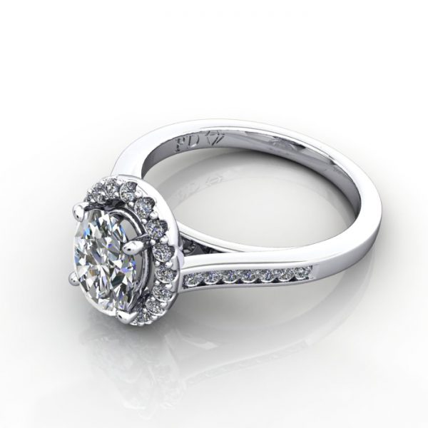 Our Oval Cut Halo Diamond Ring RH4 in luxurious Platinum is a modern take on a traditional halo design. The RH4 features a channel of diamonds in the band, and a scallop pave row of diamonds around the halo, with a single diamond in the base. The price includes gold or platinum, as well as the small diamonds in the halo and down the band, to match your selected central gemstone. Complete the pricing by selecting a central Natural or Lab-Grown Diamond, then proceed to checkout. Contact our friendly team for expert advice and to explore the possibilities.