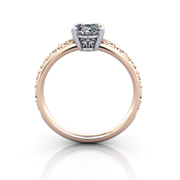 The Oval Cut Vintage Diamond Ring Rose Gold RV1 design has intricate engraving and looks fantastic. This ring style suits many diamond shapes and gemstones, including Sapphires, Rubies, and Emeralds. The style suits engagement, right-hand rings, and the ultimate dress ring. Available in any diamond carat weight and quality to suit your budget. Select a diamond below or enquire about options. It is an impressive vintage-styled ring that looks great.