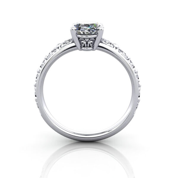 The Oval Cut Vintage Diamond Ring White Gold RV1 design has intricate engraving and looks fantastic. This ring style suits many diamond shapes and gemstones, including Sapphires, Rubies, and Emeralds. The style suits engagement, right-hand rings, and the ultimate dress ring. Available in any diamond carat weight and quality to suit your budget. Select a diamond below or enquire about options. It is an impressive vintage-styled ring that looks great.