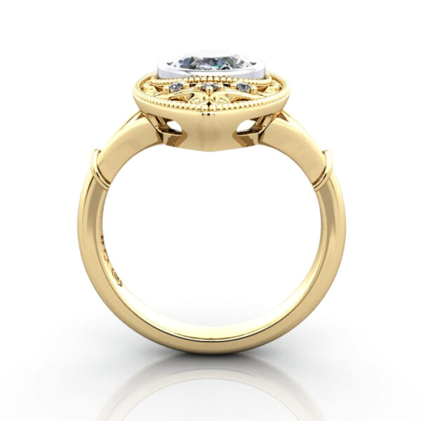 Our Oval Cut Vintage Diamond Ring RV5 in classic Yellow Gold with a Platinum setting features a stunning centre diamond secured in a protective bezel setting. The design is elevated by delicate milgrain edging and ornate filigree scrollwork, accented with petite brilliant diamonds for a touch of extra sparkle. Complete the pricing by selecting a suitable Natural or Lab-Grown diamond. Match your budget, quality and carat weight to suit your needs. Having selected, proceed to checkout or contact us for service and friendly advice.