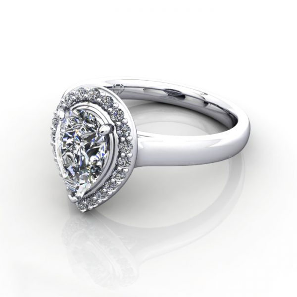 Our Pear Cut Halo Diamond Ring RH1 in luxurious Platinum looks terrific. The traditional halo setting features a brilliant halo of smaller diamonds surrounding a larger centre stone, maximising the overall sparkle and creating the look of a significantly grander diamond. This style allows a wedding ring to sit flush under the halo to form a perfect set. The price includes the ring in the metal you select, along with (18x) 1.2mm round diamonds to match the central diamond you select. Complete the pricing by selecting a suitable central diamond, either a Natural Diamond or a Lab-Grown Diamond. Contact our friendly team for expert advice.