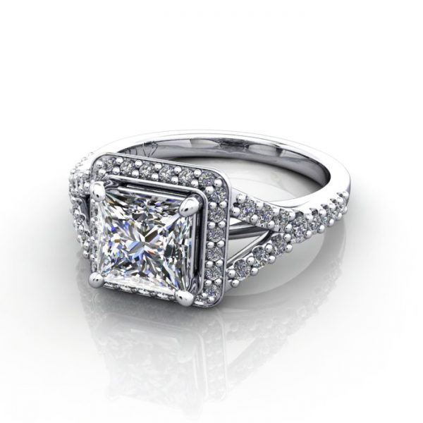 Our Princess Cut Halo Diamond Ring RH3 in luxurious Platinum features a diamond split shank. This ring design looks fantastic with lots of sparkle and wow factor, and is available in many diamond shapes, gemstones and sizes to suit any budget. Complete the price by selecting a Natural or Lab-Grown Diamond. Contact our team for advice or visit a Polished Diamonds showroom for personal service.