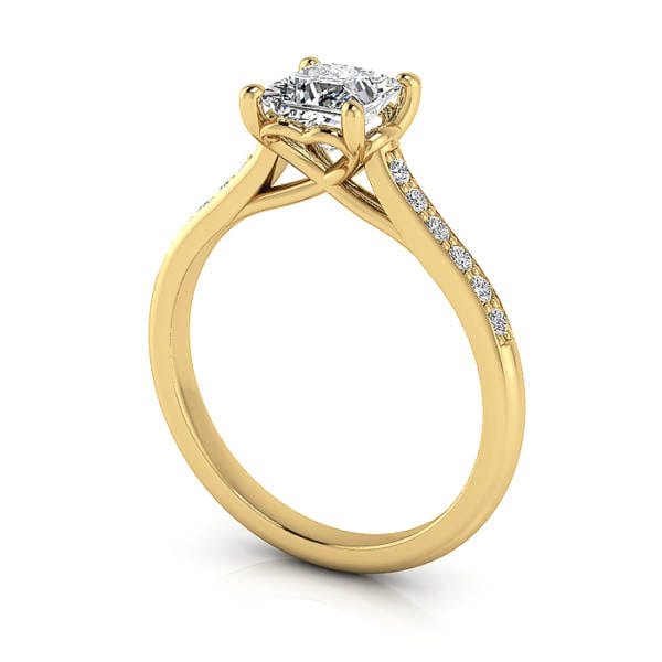 Our Princess Cut Solitaire Accent Diamond Ring RSA1 in classic Yellow Gold features a pavé row of (12x) 1.4mm diamonds down the band for extra sparkle. The price includes the Gold or Platinum ring and the small pavé diamonds to match the quality of the central diamond you select. Complete the pricing by selecting a suitable Natural or Lab-Grown Diamond. Having selected, you can go ahead and proceed to checkout or contact us for service and friendly advice.