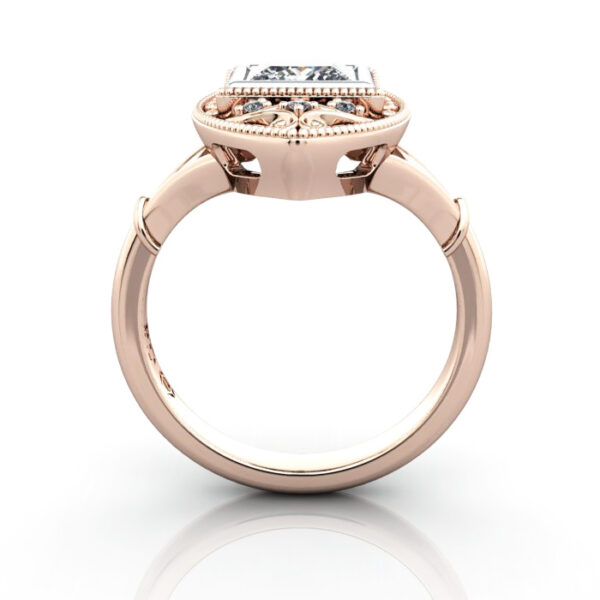 Our Princess Cut Vintage Diamond Ring RV5 in beautiful Rose Gold with a Platinum setting features a stunning centre diamond secured in a protective bezel setting. The design is elevated by delicate milgrain edging and ornate filigree scrollwork, accented with petite brilliant diamonds for a touch of extra sparkle. Complete the pricing by selecting a suitable Natural or Lab-Grown diamond. Match your budget, quality and carat weight to suit your needs. Having selected, proceed to checkout or contact us for service and friendly advice.