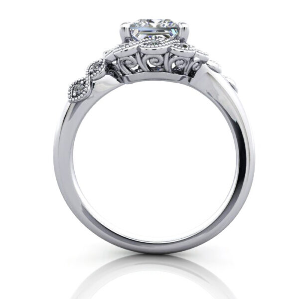 Our Princess Cut Vintage Diamond Ring RV6 in bright White Gold features a twist of bead-set 1.1mm diamonds that swirl around the central diamond. The milgrain beads that secure each small diamond offer a glimpse of the vintage-inspired style. Complete the pricing by selecting a suitable Natural or Lab-Grown diamond. Match your budget, quality and carat weight to suit your needs. Having selected, proceed to checkout or contact us for service and friendly advice.