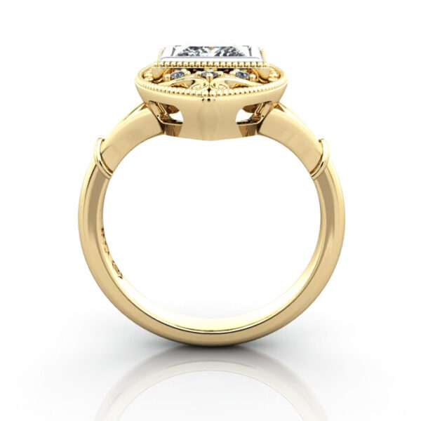Our Princess Cut Vintage Diamond Ring RV5 in classic Yellow Gold with a Platinum setting features a stunning centre diamond secured in a protective bezel setting. The design is elevated by delicate milgrain edging and ornate filigree scrollwork, accented with petite brilliant diamonds for a touch of extra sparkle. Complete the pricing by selecting a suitable Natural or Lab-Grown diamond. Match your budget, quality and carat weight to suit your needs. Having selected, proceed to checkout or contact us for service and friendly advice.