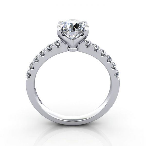 Perhaps the best-looking ring, the Round Brilliant Solitaire Accent Diamond Ring RSA4 in bright White Gold features (12x) 1.8mm scallop pave set diamonds down the band. The four-claw style suspends the central diamond for maximum sparkle. This ring design is available in many diamond shapes, gemstones and sizes to suit any budget. To complete the price, select a Natural or Lab-Grown Diamond. Contact us for personal service and friendly advice, or visit a Polished Diamond showroom.