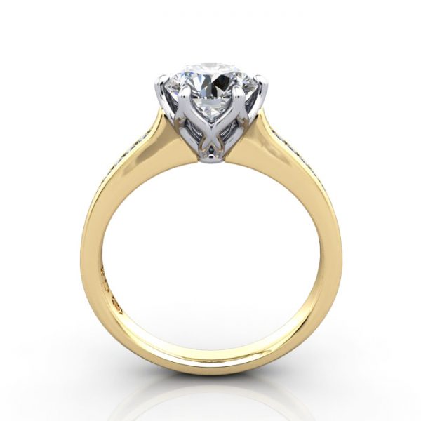 Round Brilliant Solitaire Accent Diamond Ring RSA3 in classic Yellow Gold with a Platinum setting features a channel row of (14x) 1.3mm diamonds down the band for extra sparkle. The price includes Gold or Platinum, and these small channel-set diamonds down the band match the quality of the central diamond you select. Complete the pricing by selecting a suitable natural or lab-grown diamond. Match your budget, quality, and carat weight to suit your needs. Having selected, proceed to checkout or contact us for service and friendly advice.