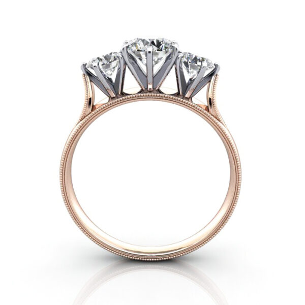 Our Round Brilliant Vintage Diamond Ring Rose Gold RV4 features milgrain beading and engraving for a vintage look. This stunning ring style is pictured and priced with (1x) 0.50ct Round Brilliant Diamond in the centre and (2x) 0.25ct Round Brilliant Diamonds on the side (1.00 carat total). Choose either Natural or Lab-Grown diamonds, and any combination of coloured gemstones, diamond sizes, and design modifications is also available. Visit a Polished Diamonds studio or contact us for information and friendly advice.