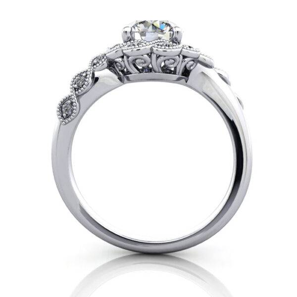 Our Round Brilliant Vintage Diamond Ring RV6 in bright White Gold features a twist of bead-set 1.1mm diamonds that swirl around the central diamond. The milgrain beads that secure each small diamond offer a glimpse of the vintage-inspired style. Complete the pricing by selecting a suitable Natural or Lab-Grown diamond. Match your budget, quality and carat weight to suit your needs. Having selected, proceed to checkout or contact us for service and friendly advice.