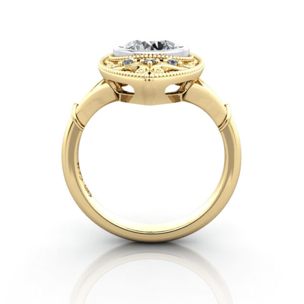 Our Round Brilliant Vintage Diamond Ring RV5 in classic Yellow Gold with a Platinum setting features a stunning centre diamond secured in a protective bezel setting. The design is elevated by delicate milgrain edging and ornate filigree scrollwork, accented with petite brilliant diamonds for a touch of extra sparkle. Complete the pricing by selecting a suitable Natural or Lab-Grown diamond. Match your budget, quality and carat weight to suit your needs. Having selected, proceed to checkout or contact us for service and friendly advice.