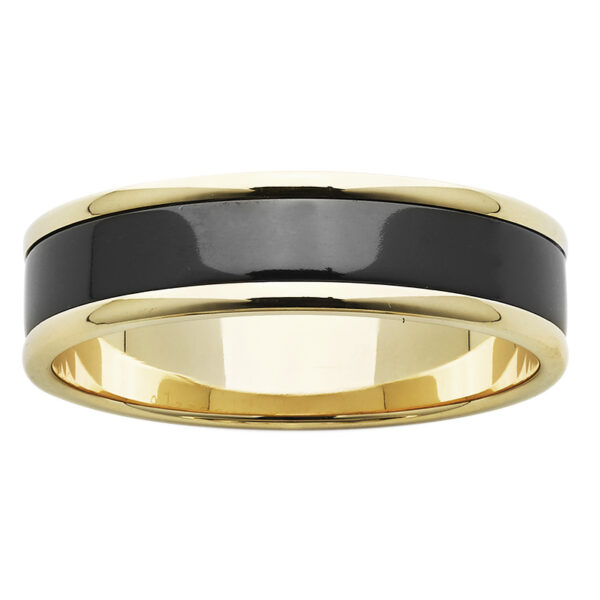 A classic Black Zirconium ring with a flat profile and available with various inlays and finishes to suit. Some men like to use an inlay to match the ladies like yellow, white or rose gold and also Platinum. Pictured here in silver as an economical inlay. Use the selectors to select and inquire or go to check out.
