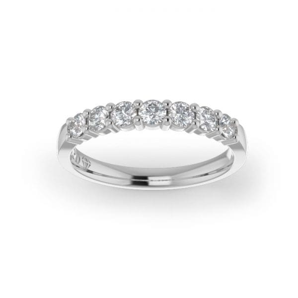 The Platinum Shared Claw Diamond Wedding Ring. This diamond ring is set higher for maximum sparkle. Select your wedding ring options, such as width, carat weight, gold quality, and finger size, to suit your needs. The diamonds are of high quality, F colour, and Si clarity with an Excellent cut for the best sparkle possible. Contact our customer support team to explore other options and gemstones. We can create the required wedding ring style because each ring is custom-made for your selected options. The Platinum Shared Claw Diamond Wedding Ring is a beautiful ring to consider.